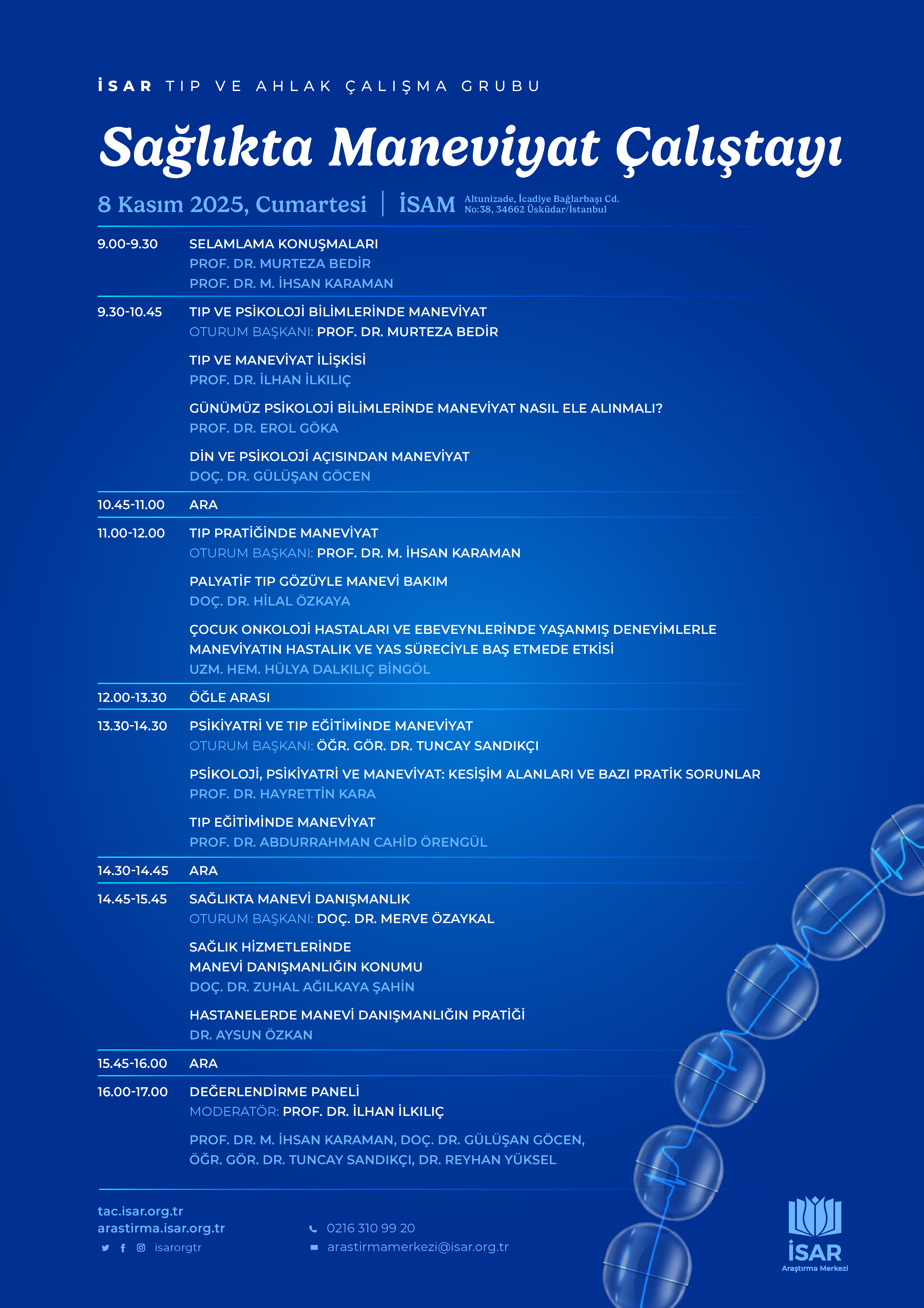 Çalıştayda tıp ve psikoloji bilimlerinde maneviyatın konumu, tıp pratiğinde manevi bakım, sağlık hizmetlerinde manevi danışmanlığın rolü ve tıp eğitiminde maneviyatın yeri gibi konular çok yönlü olarak tartışılacaktır. Program boyunca alanında yetkin akademisyen ve uzmanlar, maneviyatın modern tıbbın etik ve insani boyutlarını nasıl derinleştirebileceğine dair değerlendirmelerini paylaşacaklardır. Sağlıkta maneviyat konusuna ilgi duyan tüm araştırmacı, akademisyen ve uygulayıcılar çalıştayımıza davetlidir.